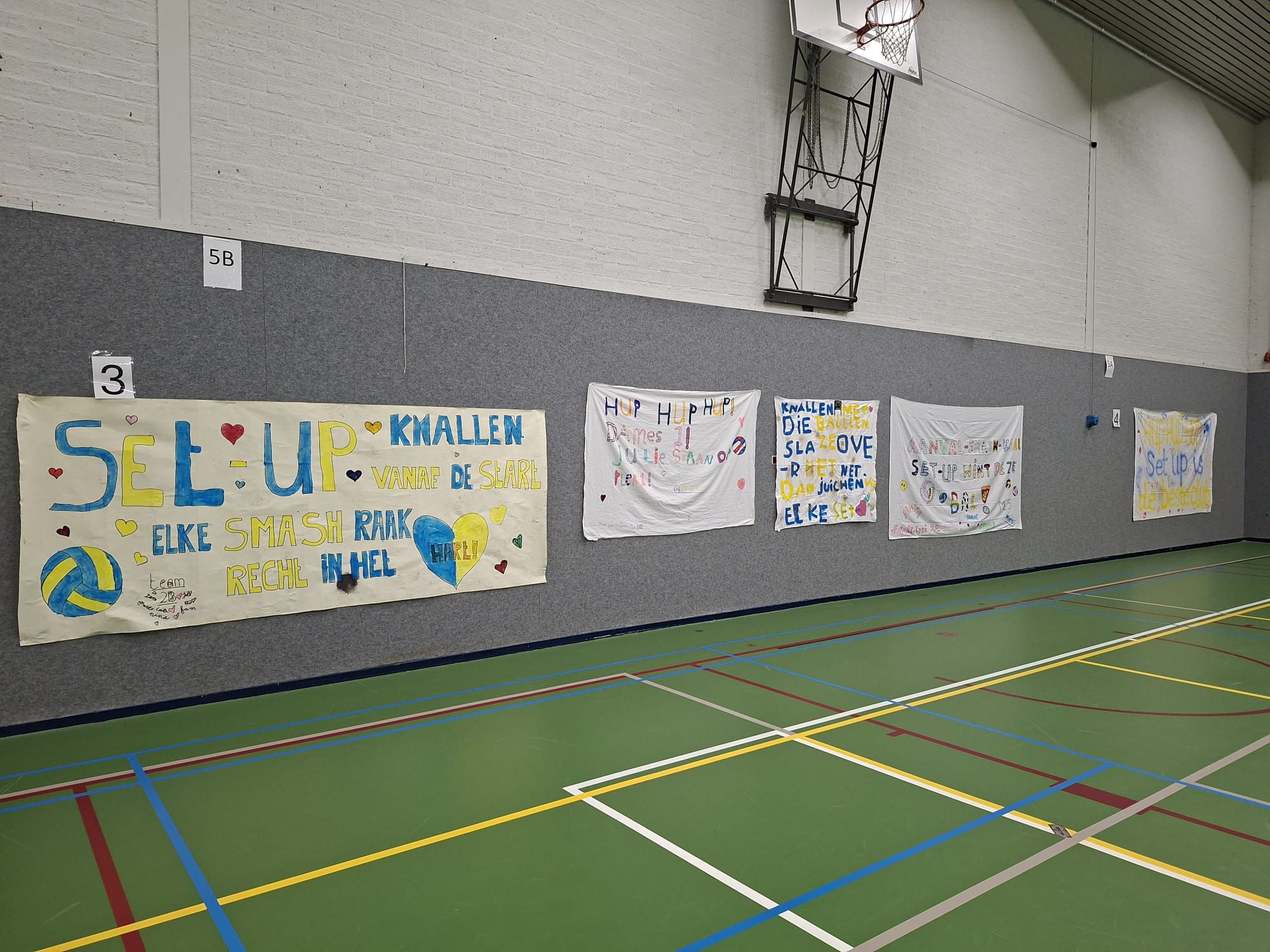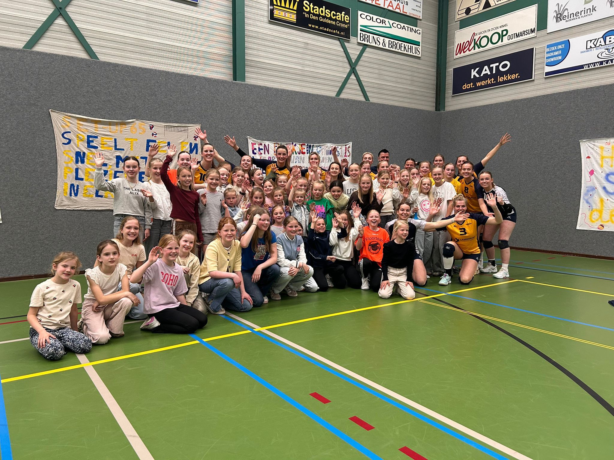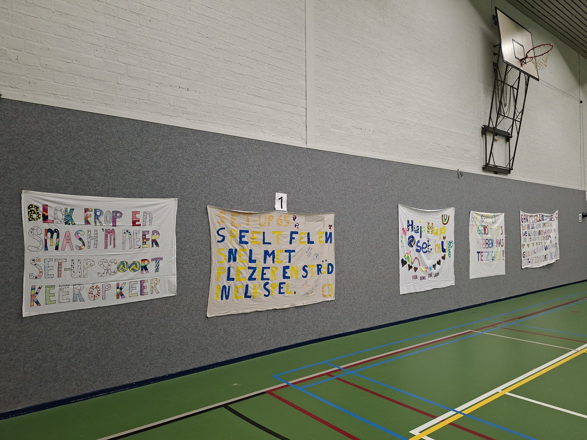 Er is binnen Lammerink Set-Up ’65 nog een activiteitencommissie en zij organiseren en coördineren allerlei initiatieven voor de jongste Set-Up ’65 jeugd en dat doen ze op een voortreffelijke wijze. Voor de zaterdag tijdens dit Smashing weekend zorgden ze voor prachtige ingrediënten om er een Super Saturday van te maken. Met veel enthousiasme gingen de jeugdteams aan de slag om de mooiste en meest creatieve spandoeken te maken – niet alleen voor de spandoekenwedstrijd, maar natuurlijk ook om Set-Up extra aan te moedigen tijdens de wedstrijden! In de keuken van de sporthal kantine waren leden van deze commissie fanatiek bezig om broodjes te snijden en frikandellen te frituren. Het drinken werd klaar gezet. Om 17:00 uur werden alle fanatieke, jonge supporters met een zelfgemaakt spandoek beloond met een heerlijk broodje frikandel en wat drinken. Daarna hebben ze samen dames 1 fanatiek aangemoedigd vanaf de tribune.