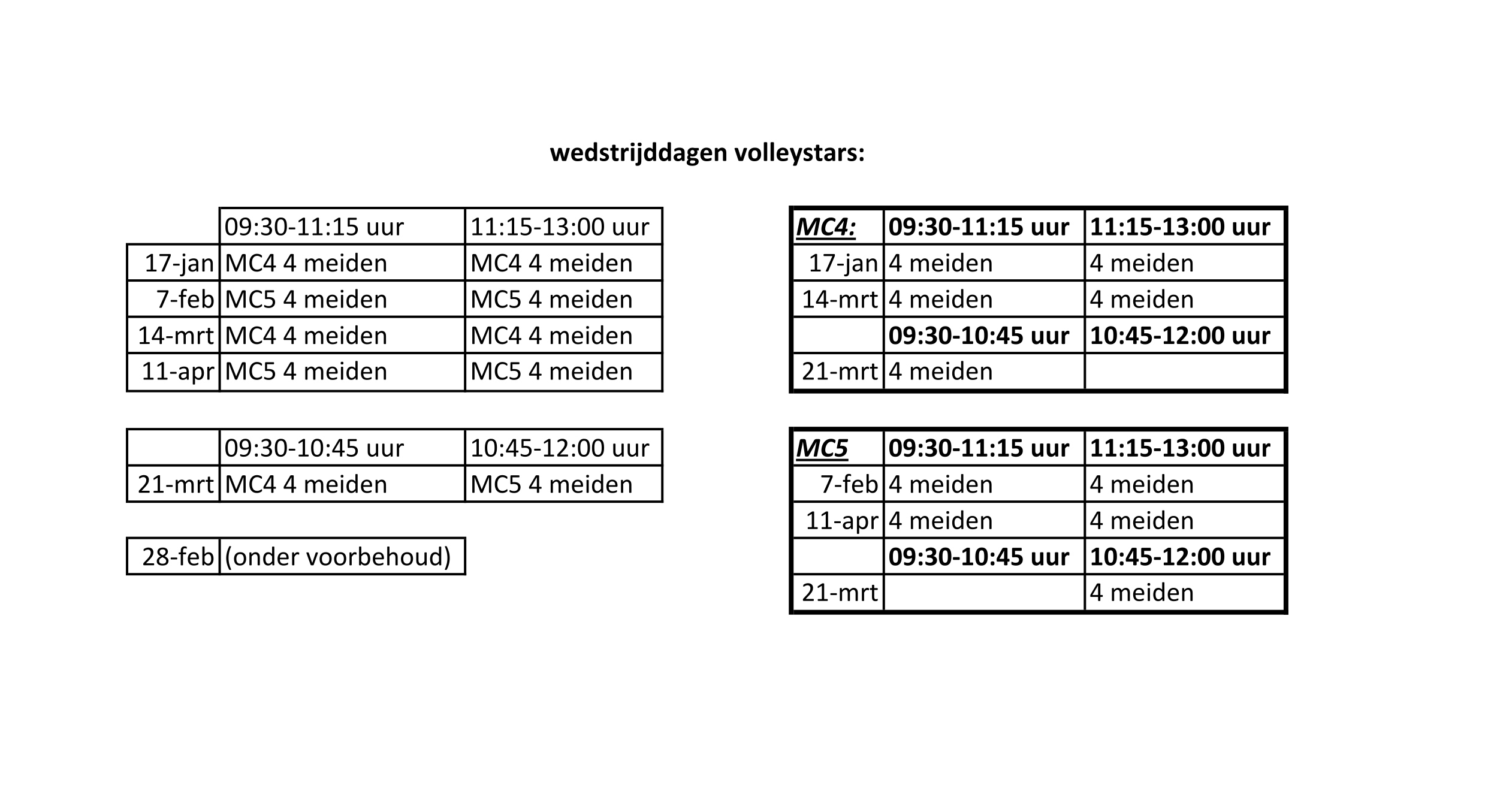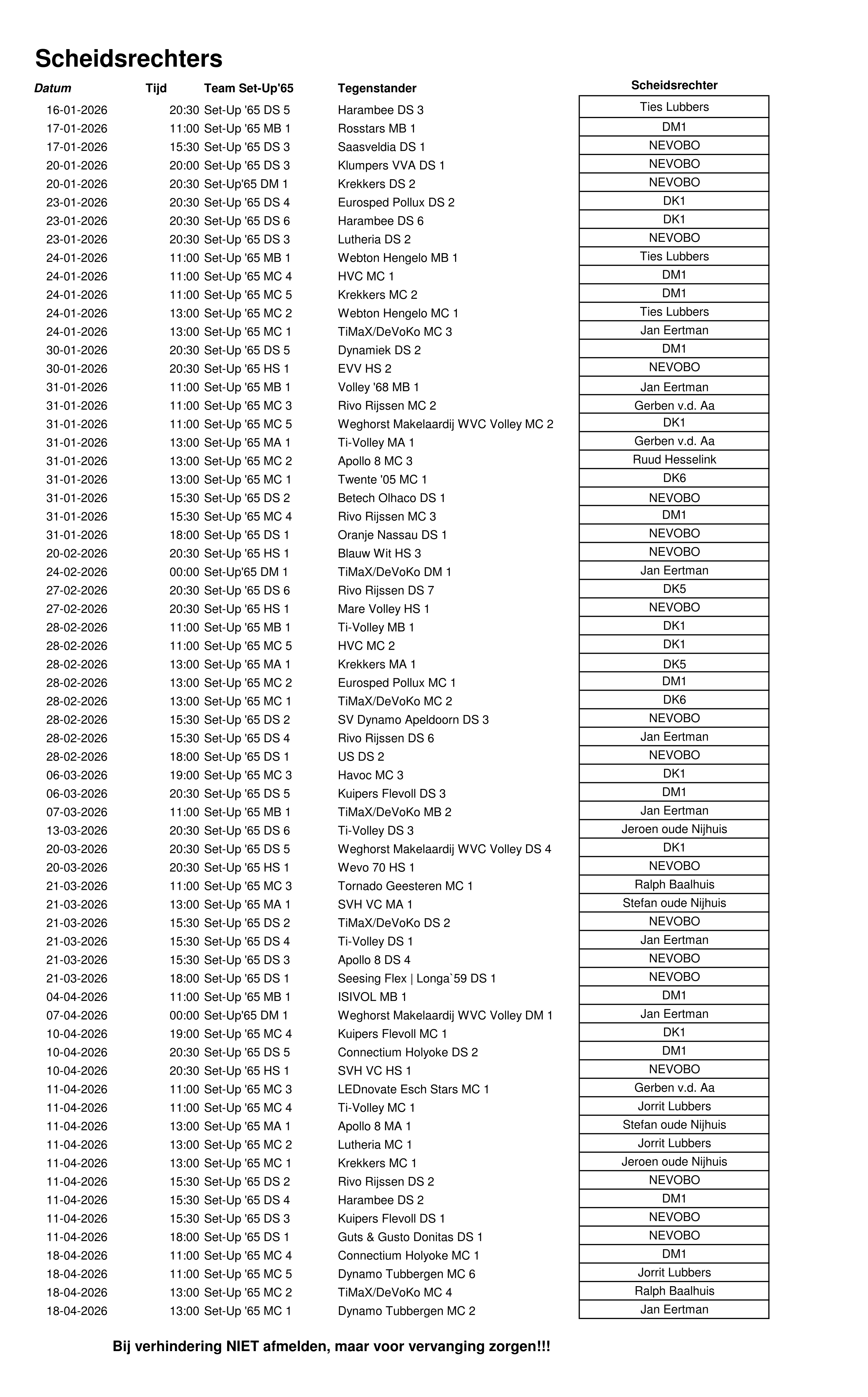 Onderstaand het schema van het fluiten en tellen bij Nevobo-competitie 2e helft seizoen 2025-2026: